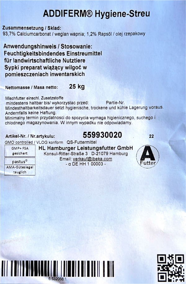 Addiferm Hygiene-Streu 25kg – Sypki preparat wiążący wilgoć w pomieszczeniach inwentarskich kurnikach, oborach, chlewniach.